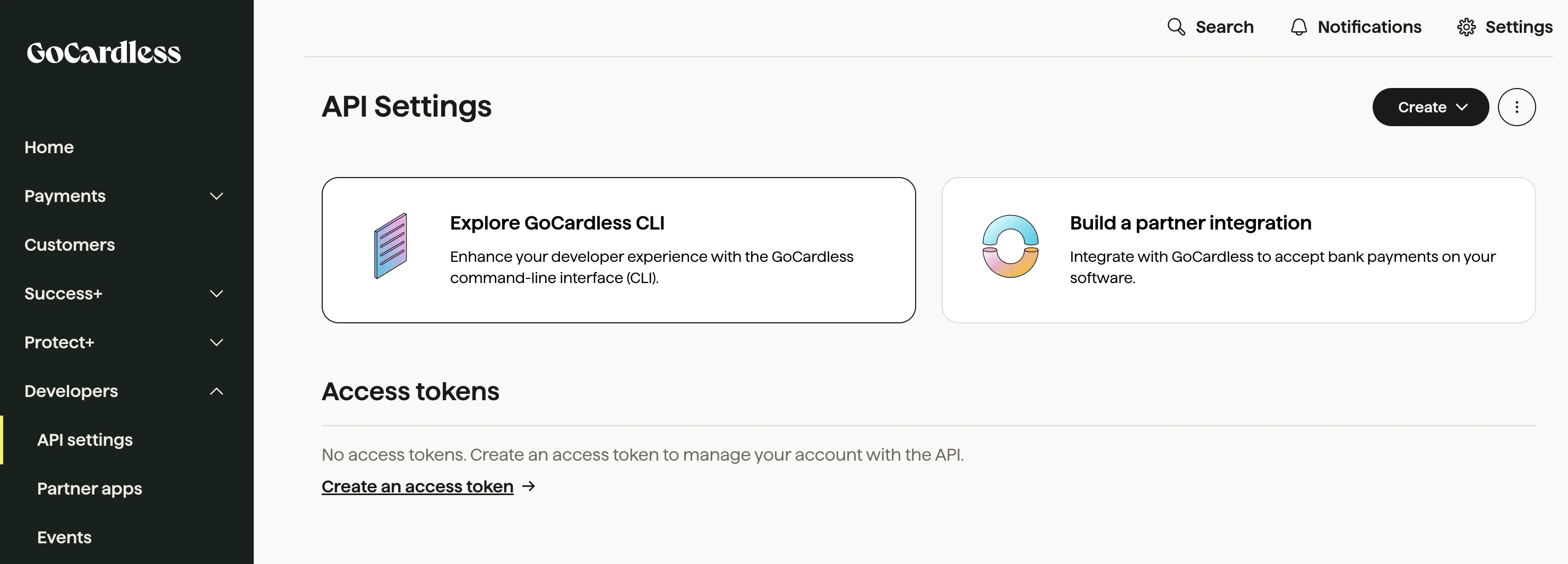 Find the access token in the GoCardless Admin Portal under Developers -> API Settings -> Access Tokens.
